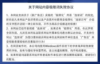 本公司全力支持關(guān)于《中華人民共和國廣告法》實施的“極限化違禁詞”相關(guān)規(guī)定,且已竭力規(guī)避使用相關(guān)“違禁詞”(如最,頂級,領(lǐng)先,第一,)等極限化詞匯。本公司于已經(jīng)將網(wǎng)站上所有“極限化”違禁詞修改,如果還有遺漏修改的“極限化”違禁詞用在本公司網(wǎng)頁,本公司申明全部失效。所有訪問本公司網(wǎng)頁的人員均表示知悉,否則請放棄訪問。